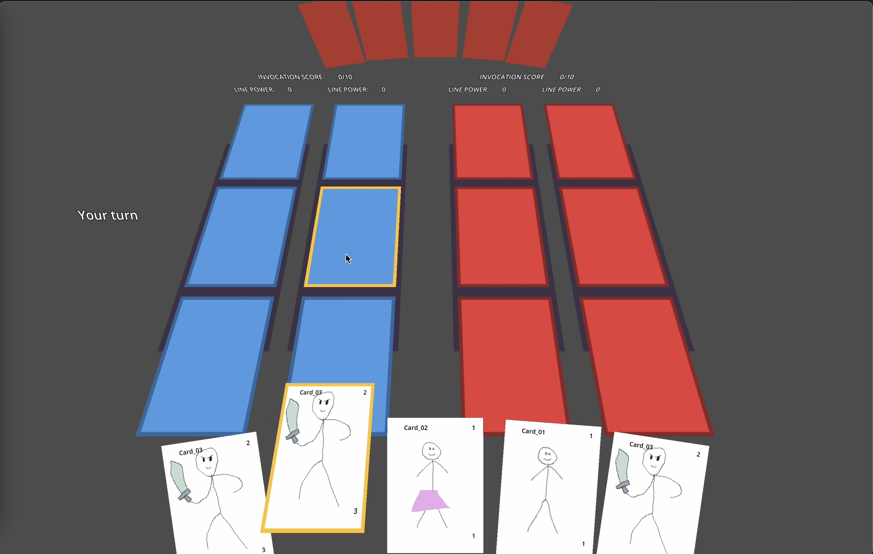 The prototype has been made both in 2D and 3D and had a few cards to test the balancing.