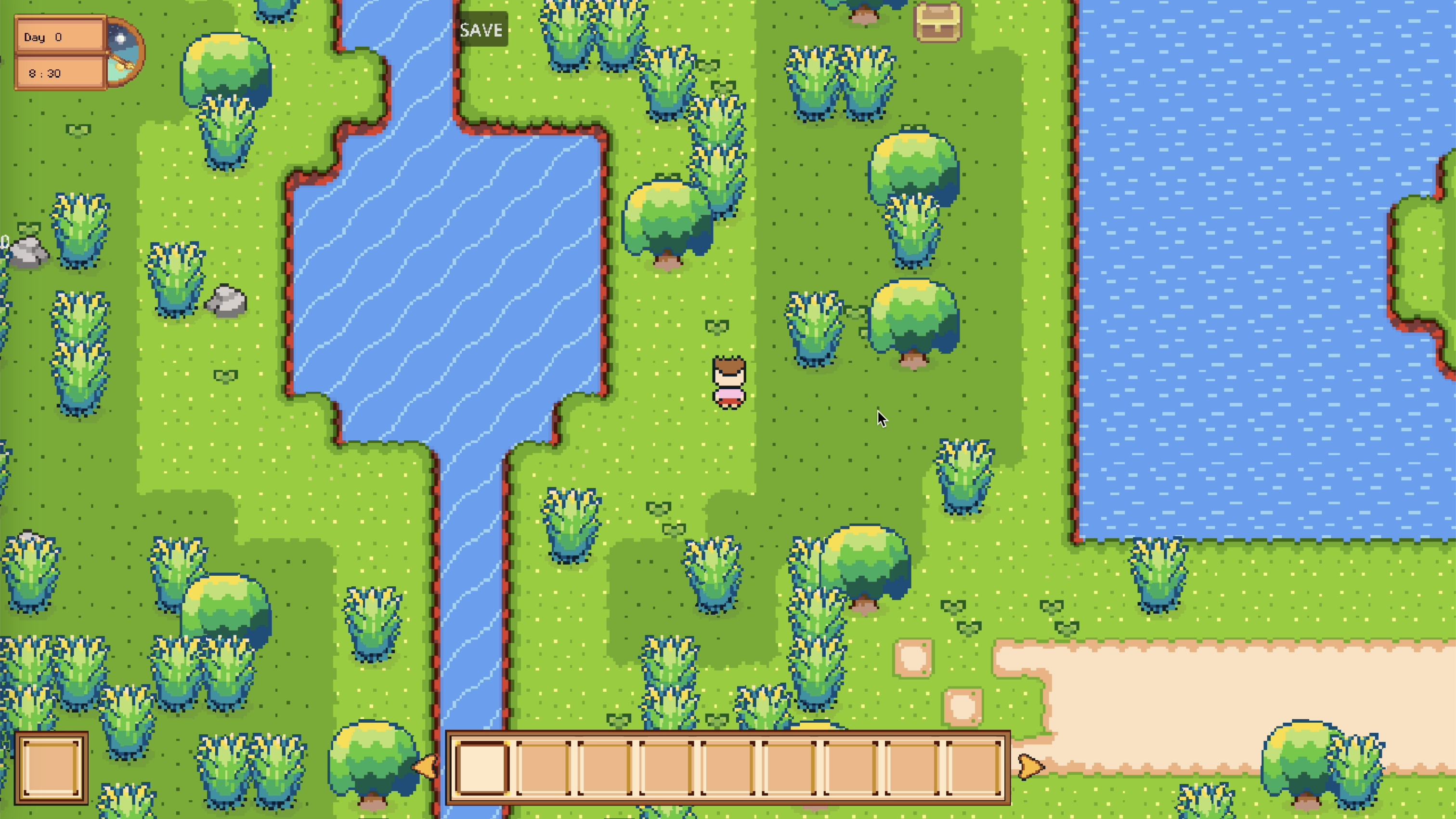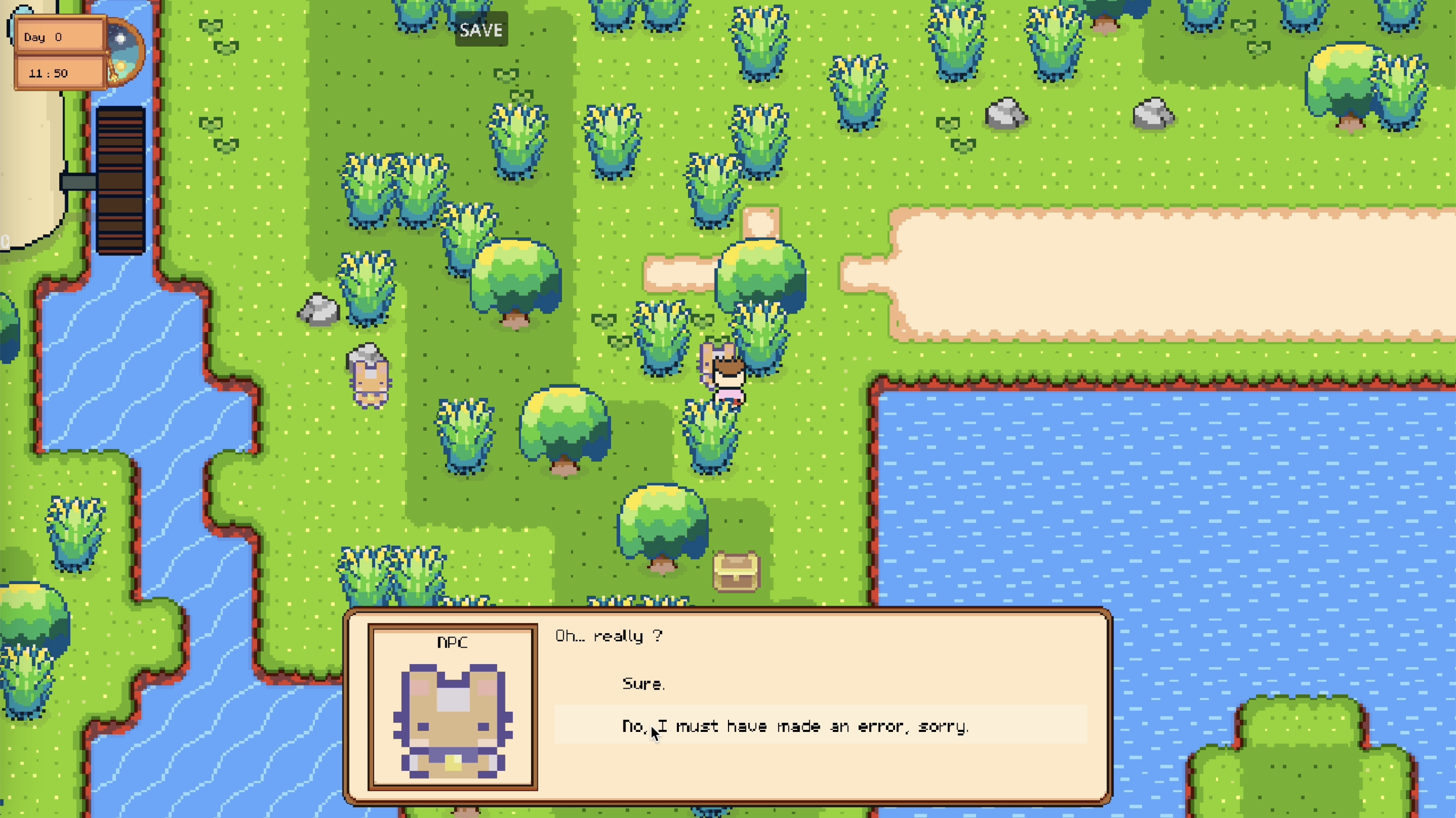 I created a slots inventory (as in Minecraft, Terraria, Stardew Valley and a lot of games...) with multiple tabs. I also added a dialogue and trading mechanics, as well as a day/night cycle with a clock.
